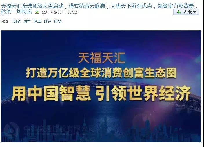 一篇博文的题目就颇为霸气:“天福天汇全球顶级大盘启动,模式结合云联惠,大唐天下所有优点,超级实力及背景,秒杀一切快盘。”