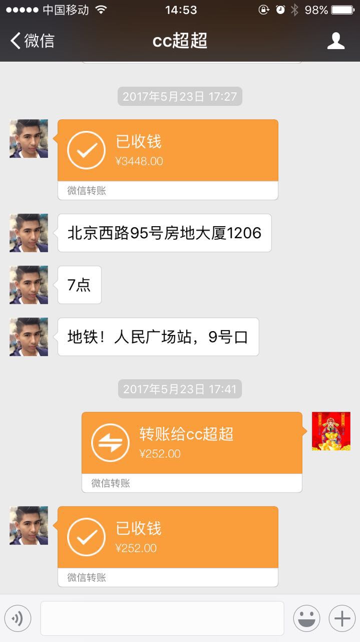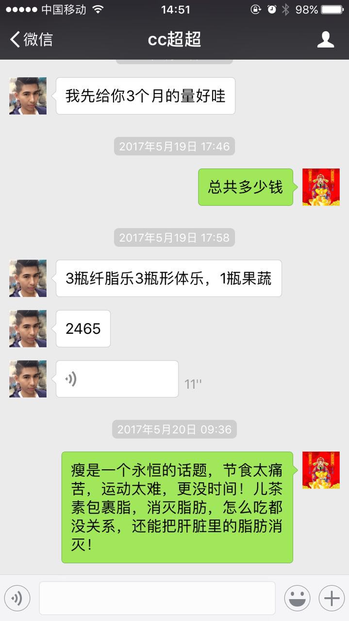 我多次考虑相信他了。终于在5月23日,我跟他以微信转账方式付了款,共3700元(3448元+252元),并且他6月初的时候把产品给到了我,跟我介绍了产品的具体吃法,给我产品的时候他跟我说尽量控制高热量食物和碳酸饮料,我表示答应。于是之后我便一直按他说的要求吃产品,并且几乎不喝碳酸饮料(差不多一个月一两次),也很控制高热量食品的摄入。甚至还办了张健身卡经常去运动。