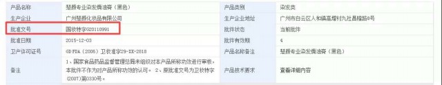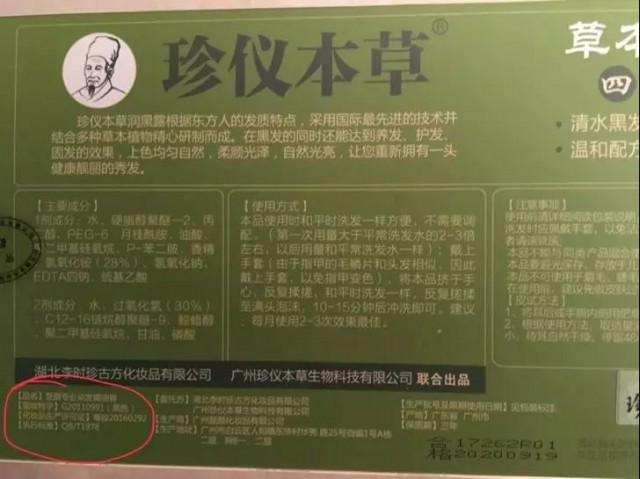 珍仪本草在产品包装背面很明显的写着生产商是广州楚颜化妆品有限公司,该产品国妆特字号为G20110991,这正是楚颜专业染发焗油膏的批准文号。