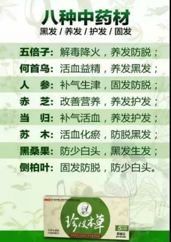 在珍仪本草对外的介绍中,都表明了产品包含八种中草药成分:五倍子、何首乌、人参、赤芝、当归、苏木、黑桑果、侧柏叶。以“李时珍中药秘方”作为产品卖点来宣传。
