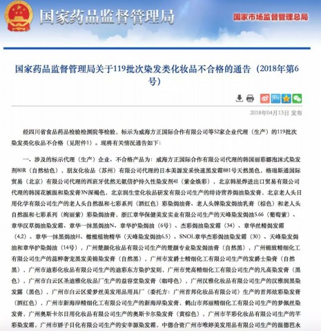 近日,国家药品监督局关于《119批次染发类化妆品不合格的通告》,威海方正国际合作有限公司代理的韩国丽彩娜泡沫式染发剂80R(自然桔色)、SNOL章华杰彩焗油染发霜(30)、广州楚颜化妆品有限公司生产的楚颜专业染发焗油膏(自然黑)等产品不合格。