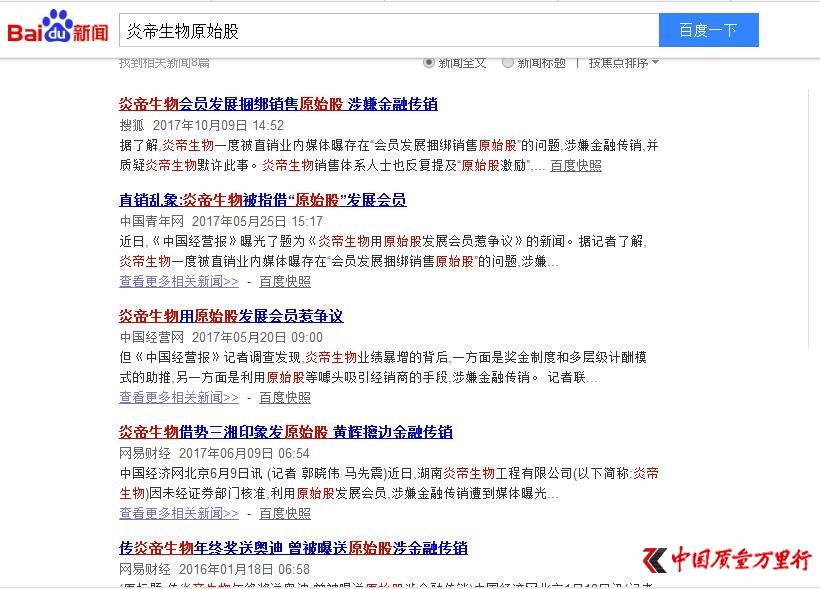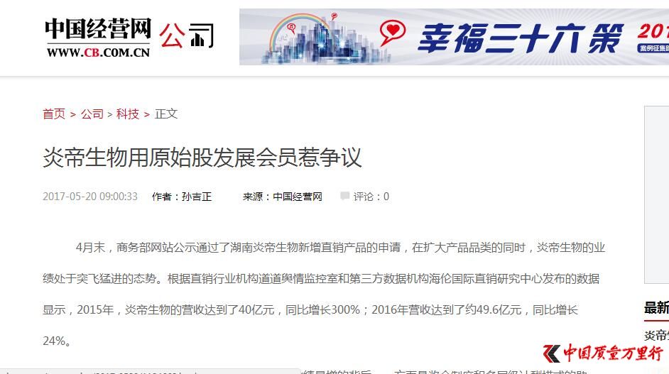 记者通过百度搜索炎帝生物相关新闻报道发现,多家主流媒体转载了关于炎帝生物借用原始股发展会员的舆论。其中,中国经营网在去年5月20日发表了题为《炎帝生物用原始股发展会员惹争议》一文,该报道中指出,2015年,炎帝生物的营收达到了40亿元,同比增长300%;2016年营收达到了约49.6亿元,同比增长24%。但炎帝生物业绩暴增的背后,一方面是奖金制度和多层级计酬模式的助推,另一方面是利用原始股等噱头吸引经销商的手段,涉嫌金融传销。