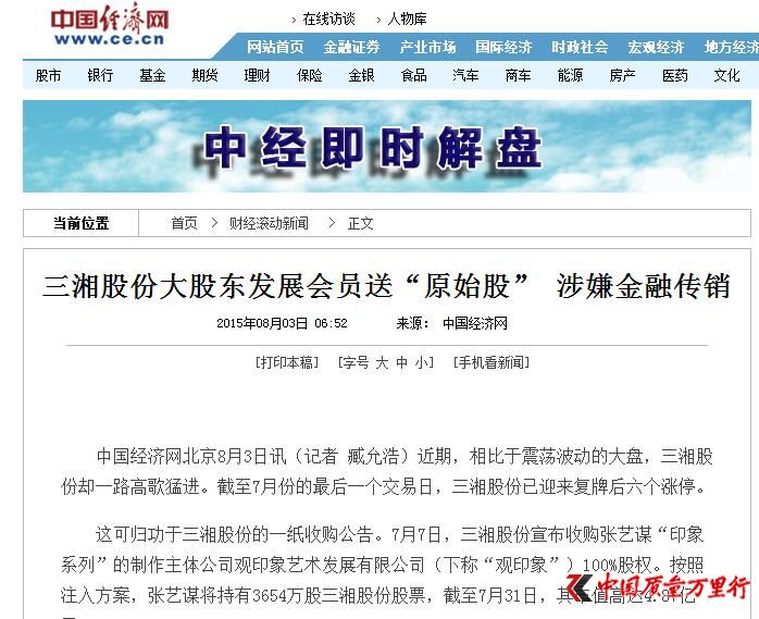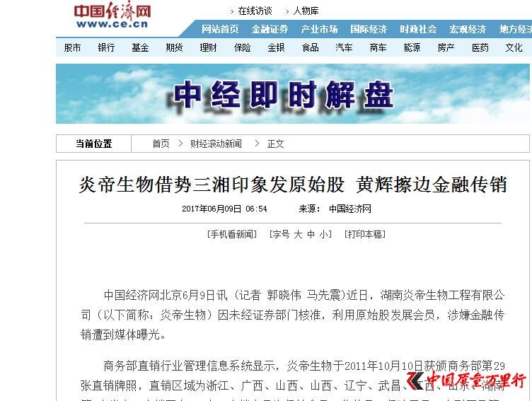 2015年8月3日与2017年6月9日与,中国经济网分别发表了题为《三湘股份大股东发展会员送“原始股” 涉嫌金融传销》、《炎帝生物借势三湘印象发原始股 黄辉擦边金融传销》,两篇报道中提到,一位自称炎帝生物华盛国际系统销售人员的人士对中国经济网记者表示:“炎帝生物是三湘控股的全资子公司,而这家公司还拥有一家上市公司——三湘股份,所以炎帝生物是一家财力相当雄厚的公司”。