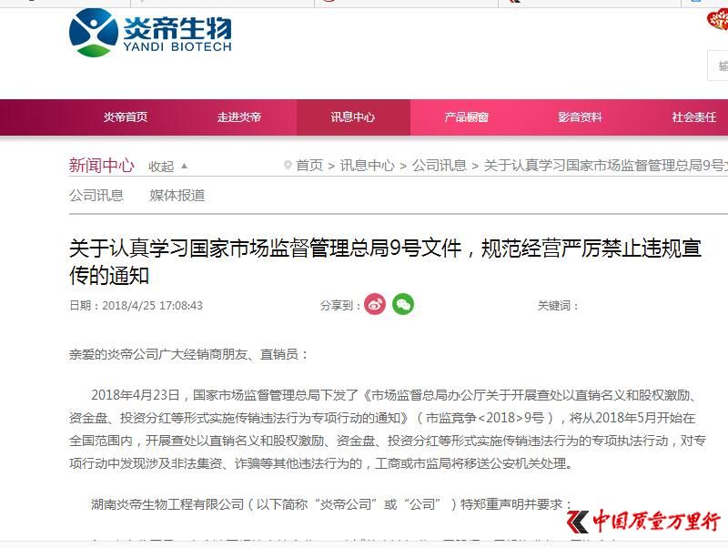 近日,记者发现在湖南炎帝生物工程有限公司(简称:炎帝生物)官网发布一则题为《关于认真学习国家市场监督管理总局9号文件,规范经营严厉禁止违规宣传的通知》,炎帝生物在该通知中郑重声明并要求: