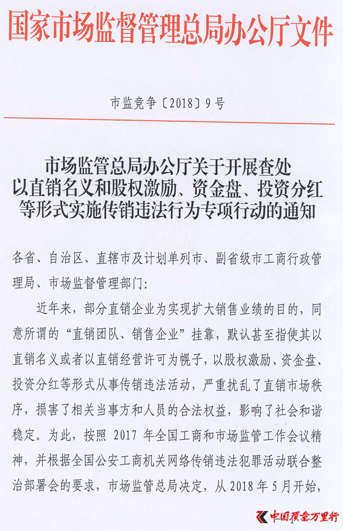 该通知发于4月25日,是针对今年4月23日,国家市场监督管理总局下发了《市场监督总局办公厅关于开展查处以直销名义和股权激励、资金盘、投资分红等形式实施传销违法行为专项行动的通知》(市监竞争<2018>9号)。
