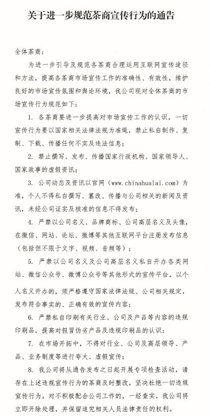 受制于日益严峻的舆论环境,在2018年4月3日及5月8日,华莱生物在其官网先后发布了《关于进一步规范市场经营行为的通知》和《关于进一步规范茶商宣传行为的通告》,旨在通过规范整顿全体茶商的宣传行为,来规避当下舆论所带来的风险以及影响。