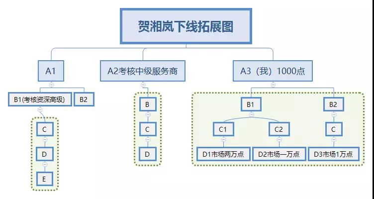 为了让大家看懂其中的利益关系,在这里和大家说一下康宝莱职级考核制度和贺湘岚的下线拓展图。