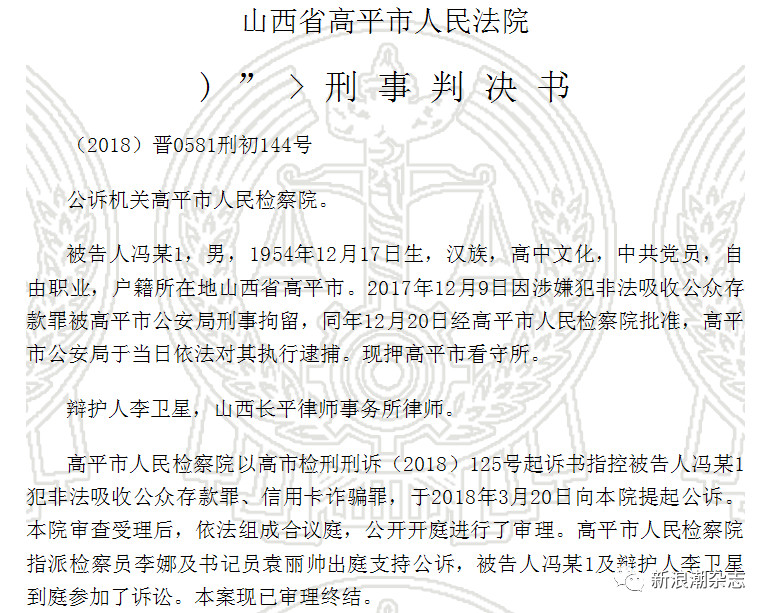 这份被公示判决书里的冯某1,为山西高平市人,1954年出生,其以所设立公司金裕通投资公司为主体,非法集资2000余万,投资隆力奇770万。最终,于去年12月份案发被查。