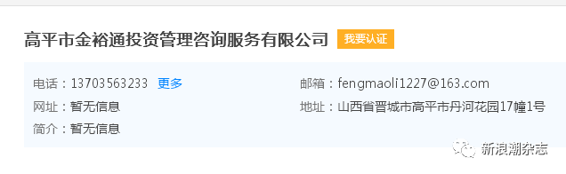 高平市金裕通投资管理咨询服务有限公司登记注册资料证实,该公司成立于2011年7月,注册资本10万元。