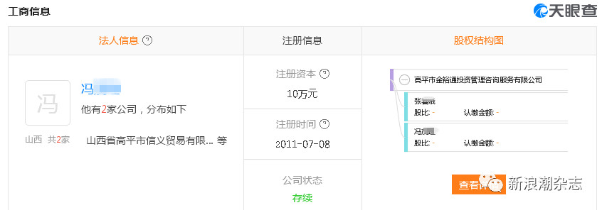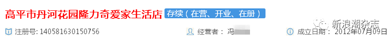 《新浪潮》记者注意到,冯某1为法人的另外一家公司,就是高平市丹河花园隆力奇爱家生活店,公司于2012年注册成立。