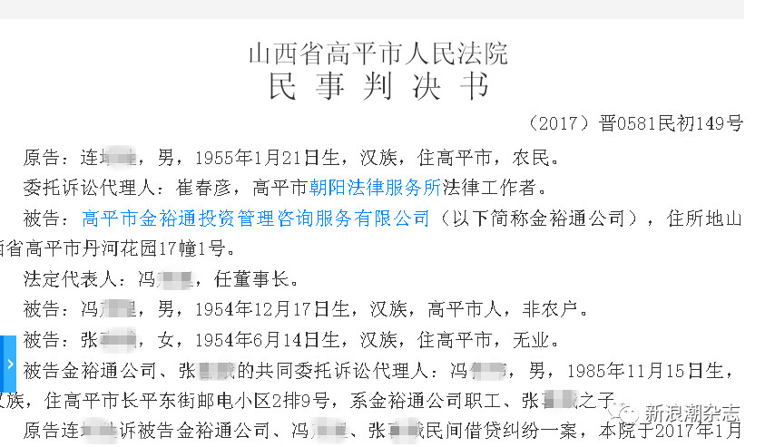 事实上,在警方立案侦查之前的2017年6月21日,高平法院就曾经审理过一起被害人与金裕通公司的民间借贷纠纷案。原告连某某请求判令被告冯某1依2014年9月17日承诺书归还原告借款本金175万元,并支付相应利息,截至2016年12月16日,归还借款本金45万元,支付利息393750元。被告为原告债务提供的位于高平市邮电小区2排9号的房屋抵押担保有效。法院认为,原告与被告金裕通公司的借贷关系有双方签订的协议及被告金裕通公司出具的收据为证,合法有效,应予以保护。最终判定被告高平市金裕通投资管理咨询服务有限公司归还原告连培胜欠款175万元,自2014年9月17日起,按年利率10%支付利息,至欠款还清之日止(沙发折款3万元从中折抵)。被告冯某1对该债务承担连带还款责任。