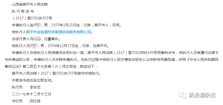 2017年12月13日,高平法院出具一份执行裁定书,在执行过程中被执行人因涉嫌非法吸收公众存款被刑事拘留,案件终结执行。