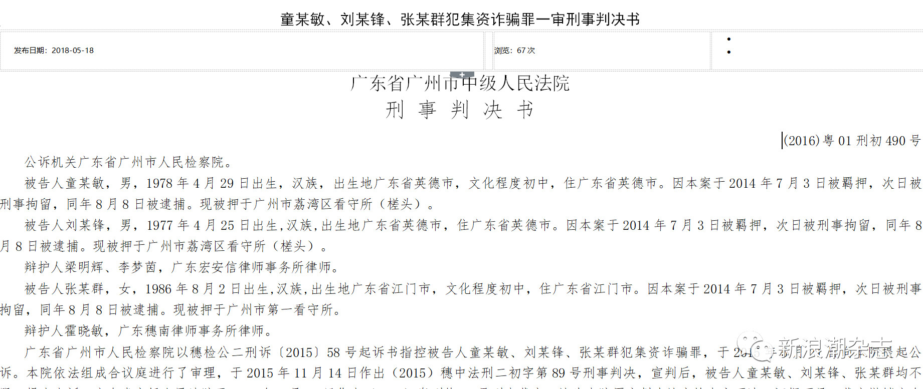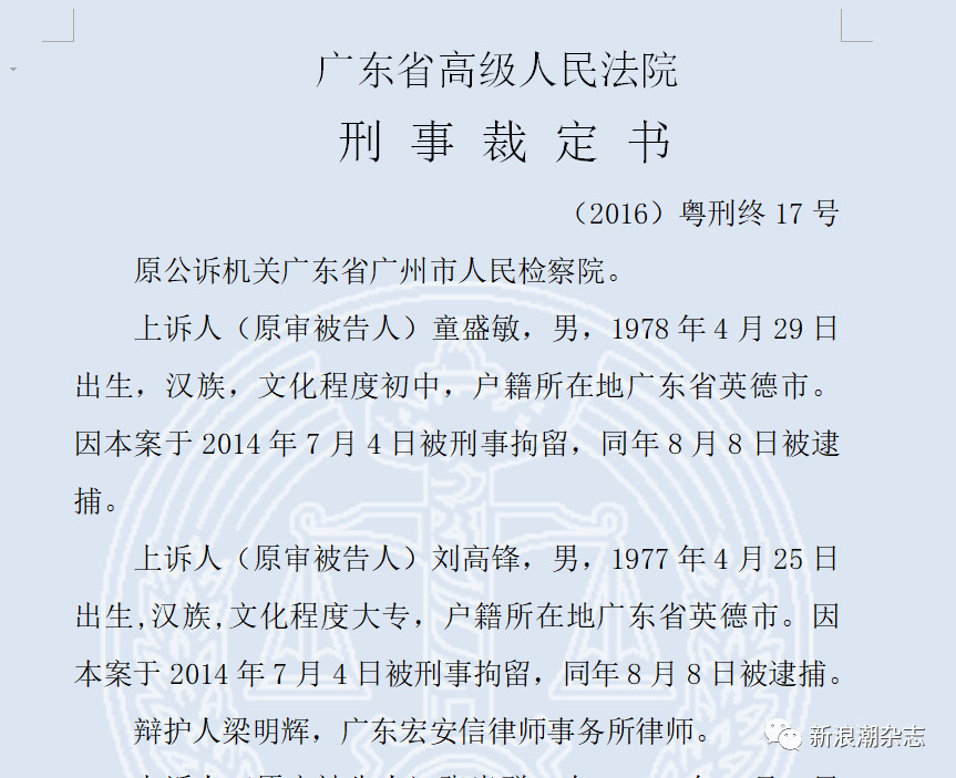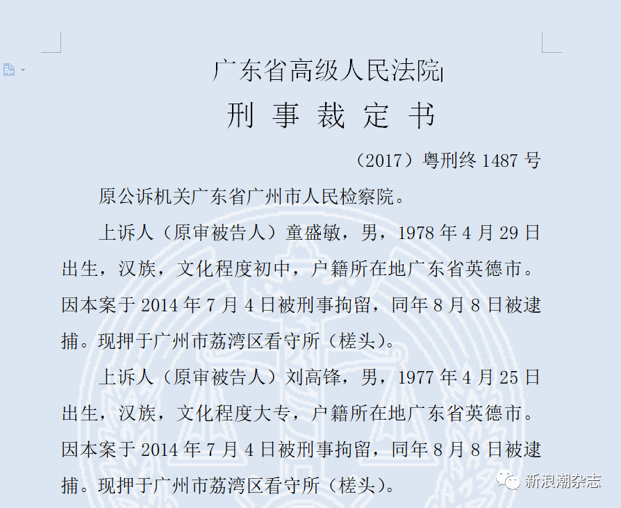《新浪潮》查询发现,该案件案发于2014年,经过广州市中院审理、被广东省高院发回重审、广州市中院再次审理、广东省高院受理上诉并维持原判,于2017年12月15日下发最终的裁定书。