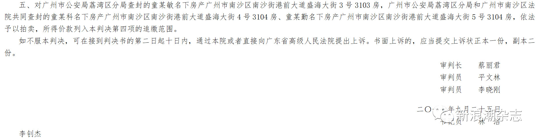 2015年11月14日,广州市中院作出(2015)穗中法刑二初字第89号刑事判决:(一)被告人童盛敏犯集资诈骗罪,判处有期徒刑十四年,并处罚金人民币四十万元。(二)被告人刘高锋犯集资诈骗罪,判处有期徒刑七年,并处罚金人民币六万元。(三)被告人张尚群犯集资诈骗罪,判处有期徒刑六年,并处罚金人民币五万元。(四)继续追缴被告人童盛敏、刘高锋、张尚群的违法所得人民币10933200元。(五)被查封三套房产予以拍卖。