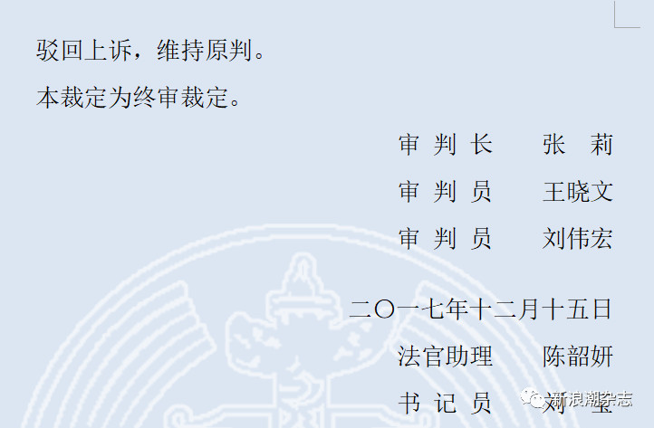 2017年12月15日,广东省高院做出裁定:驳回上诉,维持原判。
