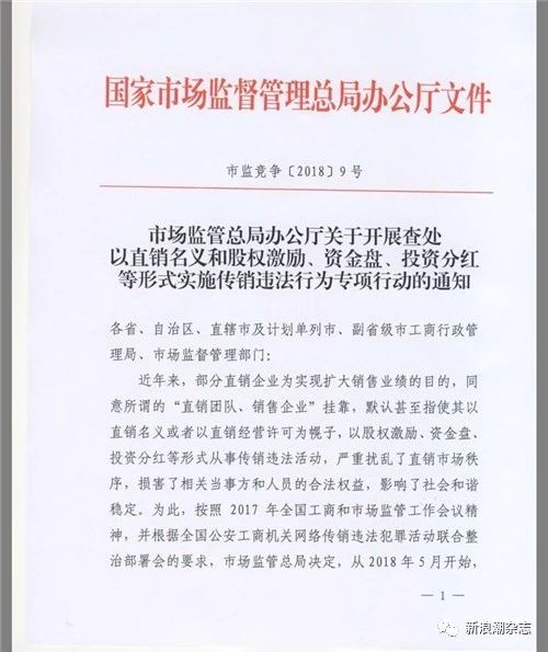 4月23日,国家市场监管总局发布《关于开展查处以直销名义和股权激励、资金盘、投资分红等形式实施传销违法行为专项行动的通知》(市监竞争<2018>9号),也就是行业内所称的“9号文”。通知指出,近年来,部分直销企业为实现扩大销售业绩的目的,同意所谓的“直销团队、销售企业”挂靠,默认甚至指使其以直销名义或者以直销经营许可为幌子,以股权激励、资金盘、投资分红等形式从事传销违法活动,严重扰乱了直销市场秩序,损害了相关当事方和人员的合法权益,影响了社会和谐稳定。