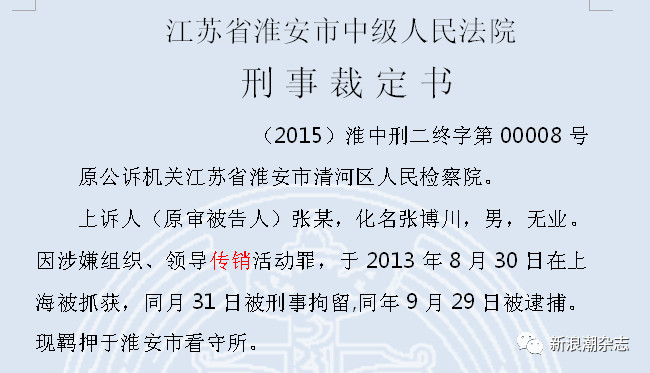 2014年11月14日,江苏淮安市清河区人民法院审理淮安市清河区人民检察院指控原审被告人张某(张博川)、苏某等人犯组织、领导传销活动罪一案,作出(2014)河刑初字第0139号刑事判决。