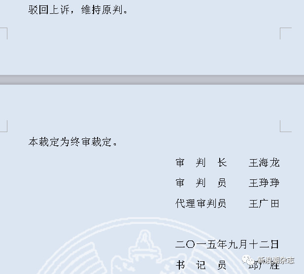 2015年9月12日,淮安市中院做出裁定:驳回上诉,维持原判。