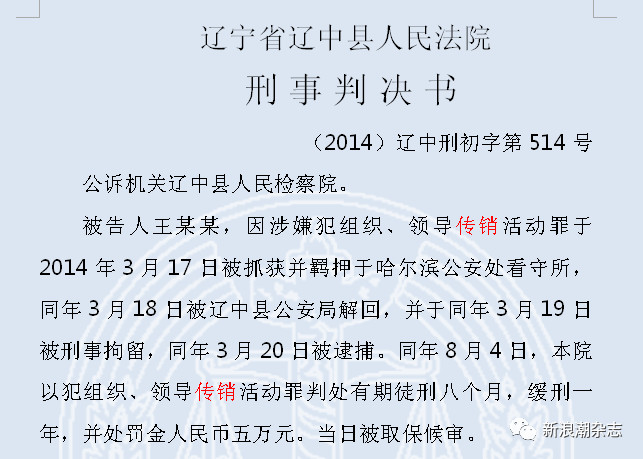 王某某因涉嫌犯组织、领导传销活动罪,于2014年3月17日被抓获并羁押于哈尔滨公安处看守所,同年3月18日被辽宁省辽中县公安局解回,并于同年3月19日被刑事拘留,3月20日被逮捕。同年8月4日,辽宁省辽中县法院以犯组织、领导传销活动罪判处有期徒刑八个月,缓刑一年,并处罚金人民币五万元。