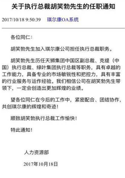 2017年10月18日,琪尔康相关公众号突然发布消息称,胡笑勃加入琪尔康公司担任执行总裁职务。而据内部人士透露,原琪尔康负责直销业务的总经理曾泽已于上周离职。
