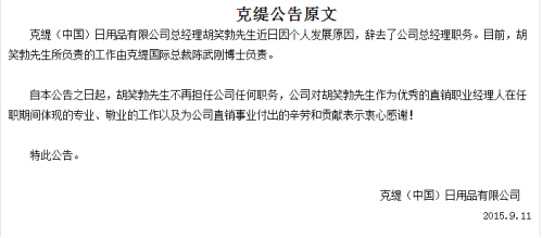 然而就在2015年9月11日,克缇官方发布公告,正式宣布总经理胡笑勃离职。直销业务由陈武刚负责。2014年胡笑勃加盟克缇出任总经理仅仅一年的时间。而胡笑勃离职的原因并不是因为能力不行,据了解,从2015年克缇公布一季度业绩来看,销售额突破4亿元,比2014年同期增长538%,在2015年4月份,克缇又创单月历史新高,达成业绩2.35亿元。对此,克缇原计划定下2015年的全面业绩目标是达成35亿元。