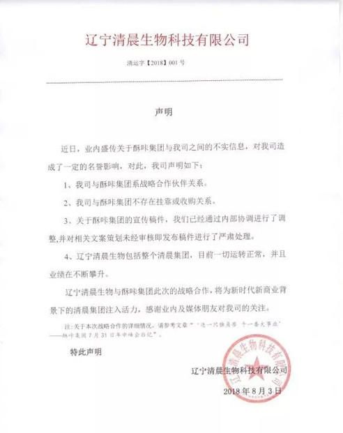 在8月3日,有着相同企业认证的广誉恒另一微信公众平台“广誉恒集团”(现已更名为“酥咔集团”)推送了《“造一只独角兽,干一番大事业”——酥咔集团7月31日年中峰会后记》一文,其中却并未提及收购清晨生物的相关事宜,只提到“两家集团无论是在战略格局还是发展愿景上已经达成了高度的统一,同时也彰显了酥咔集团与辽宁清晨生物之间紧密无间的合作关系”。