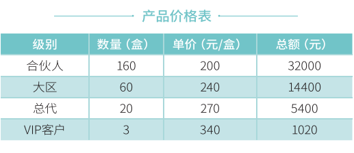 现在酥咔经销商共设有VIP客户、总代、大区以及合伙人四个基础层级,其中每个层级对应的进货量和提货价分别是:3盒(340元/盒)、20盒(270元/盒)、60盒(240元/盒)以及160盒(200元/盒)。