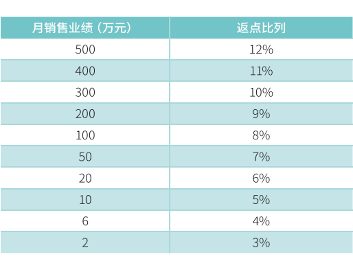 而团队管理奖,则是计算经销商当月团队销售额,业绩从2万到500万分别设置了3%到12%十层的返点比例奖励。