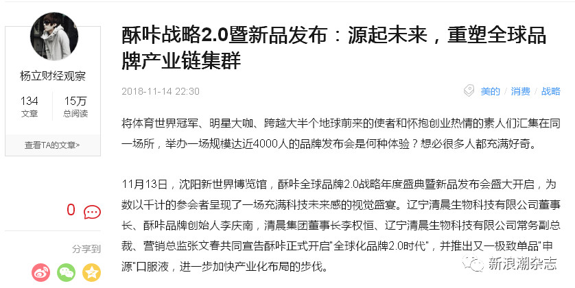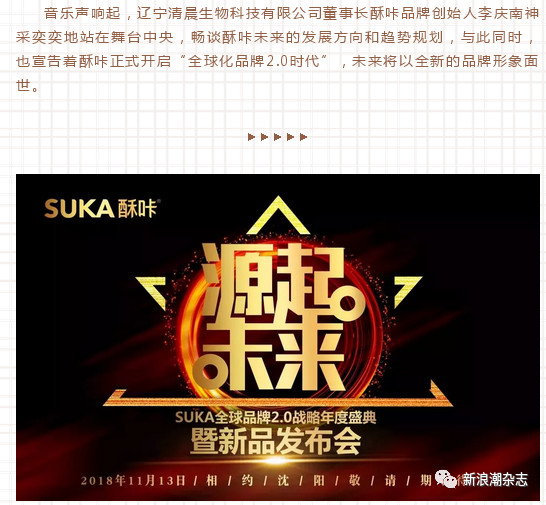 11月13日,酥咔(广誉恒运营的产品品牌)全球品牌2.0战略年度盛典暨新品发布会沈阳新世界博览馆举行。新浪潮注意到,在此次大会上,广誉恒集团董事长李庆南有了一个新的身份:辽宁清晨生物科技有限公司(以下简称“清晨生物”)董事长。