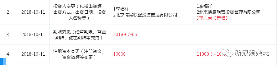 新浪潮进一步从企查查了解到,今年10月11日,清晨生物刚刚进行了投资人和注册资本变更,李庆南就是在此时成为公司的第三大股东。