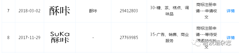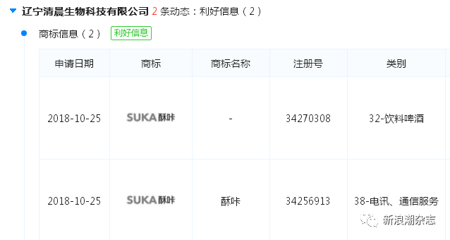 10月25日,清晨生物申请两个商标名称,公示信息显示,商标名均为“SUKA酥咔”,类别则分别是32类饮料啤酒和38类电讯、通信服务。截至目前,其所申请的两个商标状态为“申请收文”。