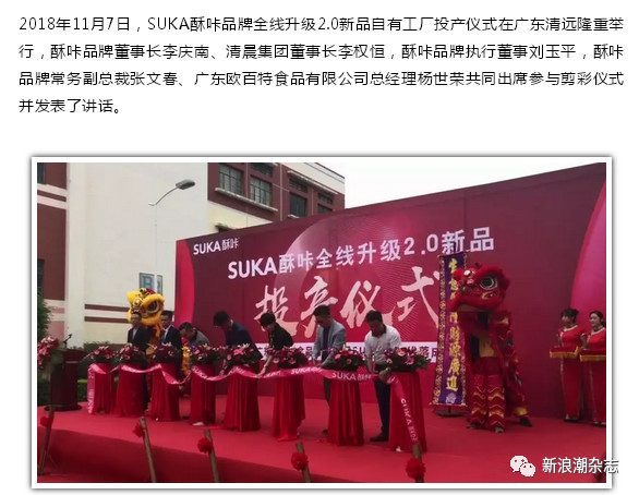 新浪潮注意到,辽宁清晨生物科技有限公司常务副总裁、营销总监张文春,在“酥咔集团”的报道中,还有另外一重身份。在题为《SUKA酥咔品牌全线升级2.0新品自有工厂投产仪式今日隆重举行!》的报道中,为酥咔品牌常务副总裁。报道称,2018年11月7日,SUKA酥咔品牌全线升级2.0新品自有工厂投产仪式在广东清远隆重举行,酥咔品牌董事长李庆南、清晨集团董事长李权恒,酥咔品牌执行董事刘玉平,酥咔品牌常务副总裁张文春、广东欧百特食品有限公司总经理杨世荣共同出席参与剪彩仪式并发表了讲话。