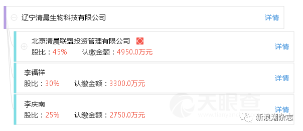 新浪潮从天眼查看到,目前的辽宁清晨生物科技公司,其股东分别为北京清晨联盟投资管理有限公司、自然人李福祥、自然人李庆南,其中李庆南以认缴2750万元的数额,持股25%。