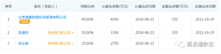 新浪潮从企查查获悉,三家股东的认缴日期均为2038年8月21日,前两者分别于2011年9月29日实缴350万元和150万元,李庆南实缴信息不详。