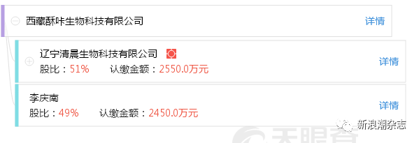 不仅如此,双方更进一步的合作还体现在,李庆南以个人身份,与清晨生物合资注册了一个公司:西藏酥咔。其中,李庆南以认缴2450万元,持股49%。