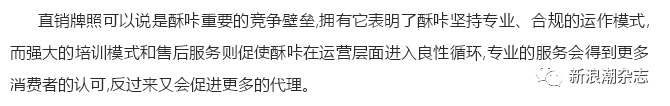 一篇分析酥咔13日活动的文章,则进一步明确指出;“直销牌照可以说是酥咔重要的竞争壁垒,拥有它表明了酥咔坚持专业、合规的运作模式,而强大的培训模式和售后服务则促使酥咔在运营层面进入良性循环,专业的服务会得到更多消费者的认可,反过来又会促进更多的代理。”