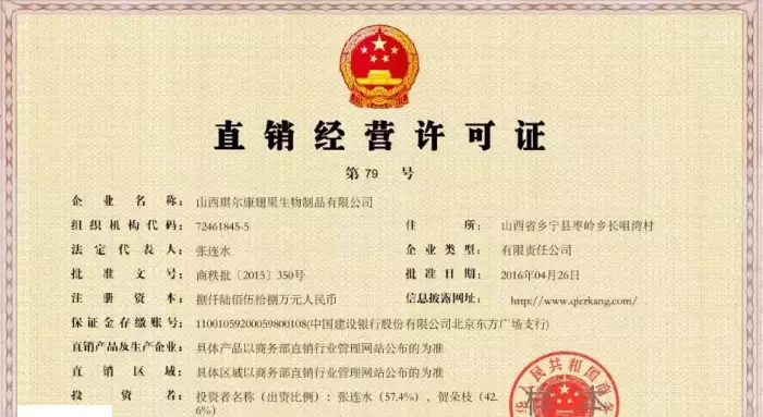 琪尔康,全名山西琪尔康翅果生物制品有限公司,成立于2000年09月06日。琪尔康主要从事翅果油系列化妆品销售、农副产品生产销售以及翅果油系列保健品生产销售等业务。2016年4月26日,琪尔康获得直销牌照,所核准的直销区域为山西省内的26个服务点,核准的直销产品只有“琪尔康牌翅果油软胶囊”这一种。