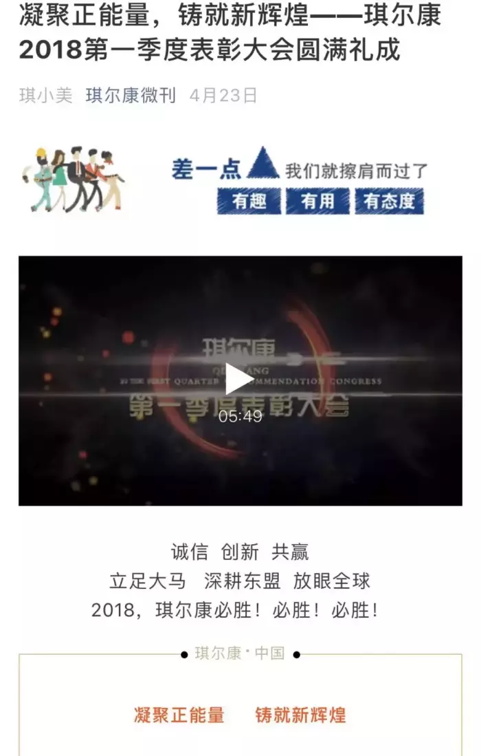 然而,面对媒体的质疑,琪尔康显得尤为“迟钝”。这种迟钝究竟是因为它“两耳不闻窗外事,一心只想多赚钱”,还是“外界说了什么,我琪尔康不care”?这两种情况我更偏向于后者。毕竟,琪尔康这厢还深陷“传销”漩涡,那边就在太原开了个千人表彰大会。