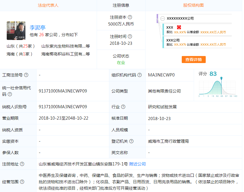 威海国药紫光中医养生有限公司成立于2018年10月23日,注册资金5000万元,法人代表李泥亭,股东构成:威海紫光科技园有限公司、国药药材股份有限公司、刘君、文元。