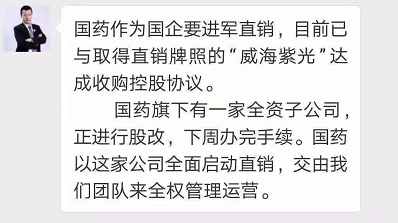 据其公司高管在群里发的信息显示,国药与威海紫光收购控股协议,国药旗下的一家全资子公司已进行股改,完成后,将由这家公司启动直销业务。
