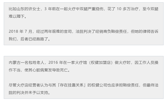 辩护时,权健公司表明自己并不提供火疗服务,与经销商没有关系。