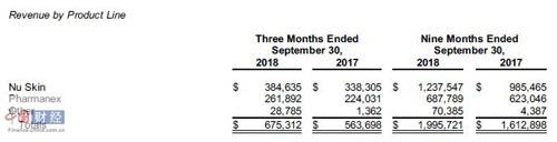 业绩优异的如新集团目前以开发和销售个人护理产品和营养补充剂为主,这些产品和营养补充剂以Nu Skin和Pharmanex品牌以及少量其他产品和服务在全球销售。据最新业绩报显示,第三季度按产品划分Nu Skin产品销售收入达3.85亿美元,Pharmanex产品销售收入达2.62亿美元,其余产品及服务收入0.28亿美元。其中,Nu Skin产品占总收入的57%。