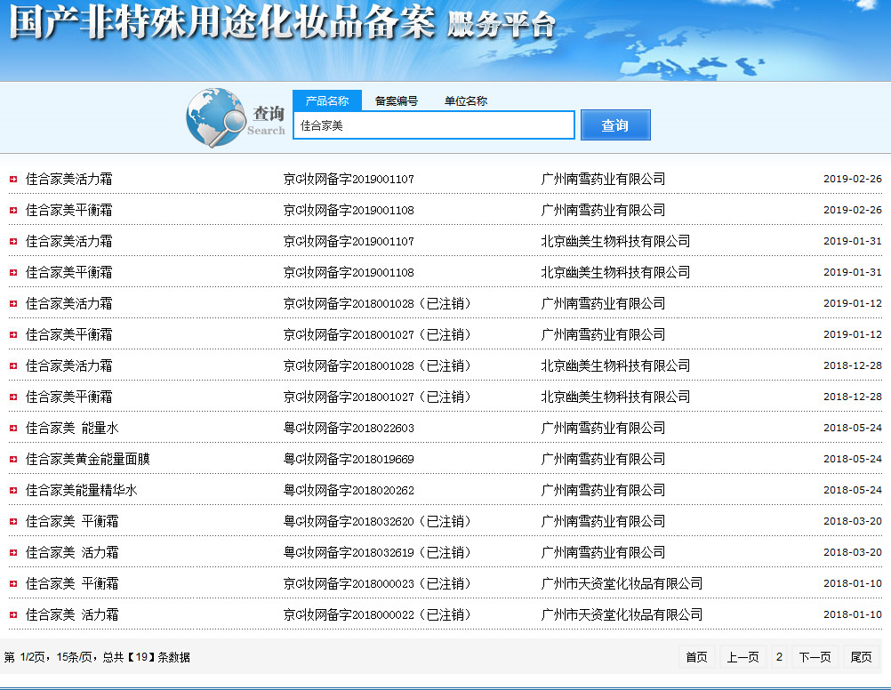 网信视点登录国家药监局官网,在国产非特殊用途化妆品备案服务平台发现,佳合家美活力霜、平衡霜最新备案编号为“京G妆网备字2019001107”、“京G妆网备字2019001108”,最新备案日期为2019年1月31日,生产企业为:北京幽美生物科技有限公司,实际生产企业为:广州南雪药业有限公司,《生产许可证》编号为:粤妆20161384。