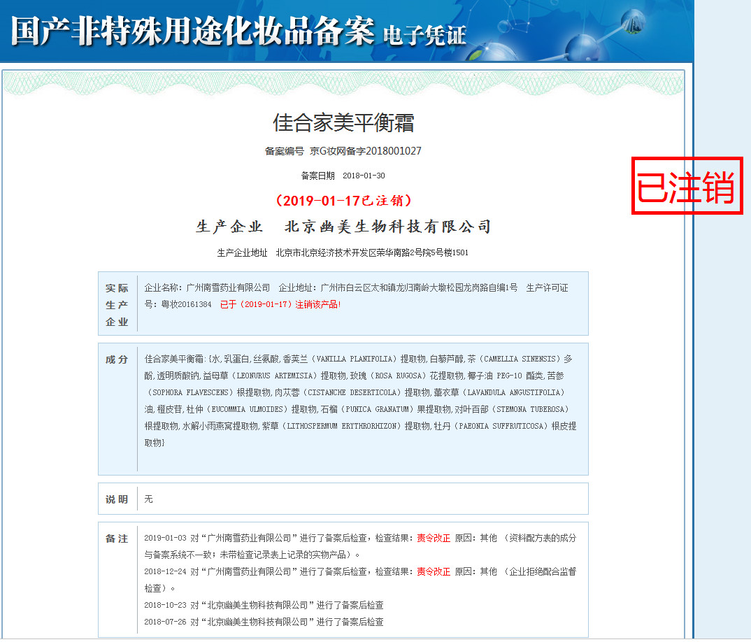 2019年1月3日,再次对“广州南雪药业有限公司”进行了备案后检查,检查结果:责令改正。原因为:资料配方表的成分与备案系统不一致;未带检查记录表上记录的实物产品。随后的情况是,2019年1月17日,产品(佳合家美活力霜、佳合家美平衡霜)被注销。