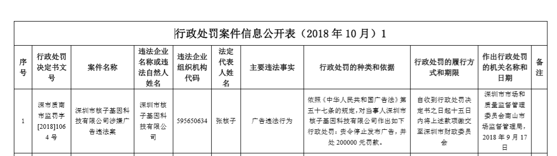 2018年9月17日,核子基因集团因广告违法行为被南山局稽查科(稽查大队)处于罚款20万元。