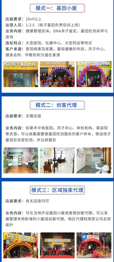 而在目前,该公司对外宣传的代理加盟模式共有三种,0基础的代理商也可以合作,这三种模式分别是:一,基因小屋;二,创客代理;三,区域独家代理,加盟费最少为32.72万元。