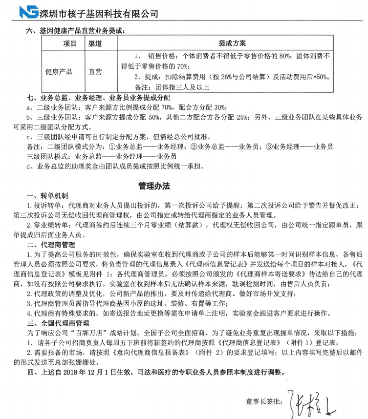 据公司官网介绍,核子基因集团成立于2012年,是一家集基因技术研发、市场应用于一体的高新科技型企业,分司法鉴定、医学检验、健康管理,科研服务四个板块。目前核子基因集团已经发展出了44个直营分公司,928名核心代理商,565家基因加盟小屋,并号称“在全国拥有100块基因检测牌照”。