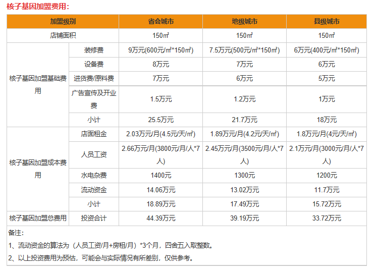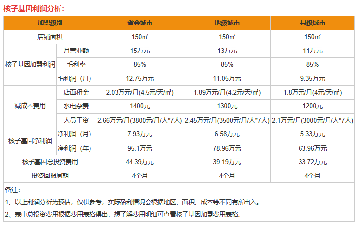 至于利润,按照核子基因官方的说法:一个基因小屋成本5~10万元,平均月利润3~5万元, 年利润45万元左右。而模式三中的地级市独家代理,则可设十家基因小屋,年利润可达500万元。