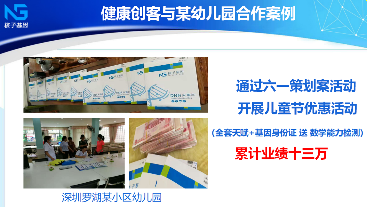 此前,核子基因的“健康创客”项目曾通过开展儿童节优惠活动(全套天赋+基因身份证,送数学能力检测),在深圳罗湖某小区幼儿园进行展业,期间累计达到业绩13万元。