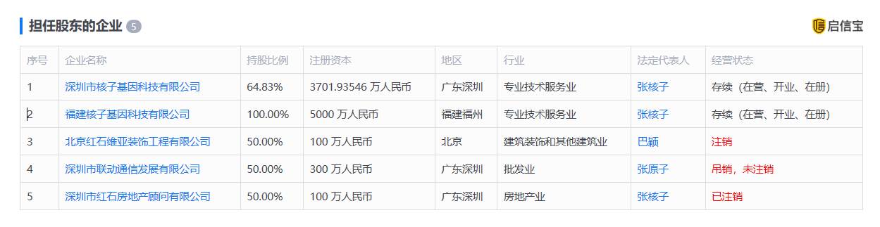 毋庸置疑,张核子的身份是核子基因集团的创始人兼总裁,但他同时还涉足了其他行业的多家公司。而在目前来看,由张核子担任股东的企业,如北京红石维亚装饰工程有限公司、深圳市联动通信发展有限公司、深圳市红石房地产顾问有限公司等多家企业都已处于吊销或注销的状态。
